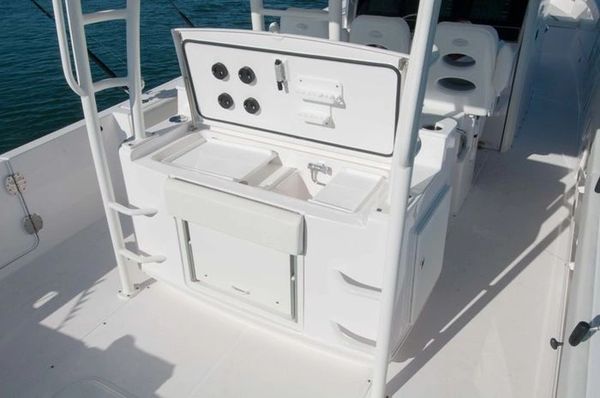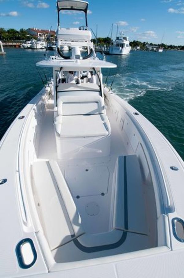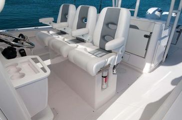The Everglades 435CC is one of the most sought-after 45 foot center consoles on the market. The layout is functional and luxurious at the same time, something that a lot of large center consoles have a tough time achieving. There is no need to sacrifice comfort on this center console and with the quad 350 HP Yamahas on the back, you will not only be on one of the most comfortable boats in the industry but also one of the fastest.